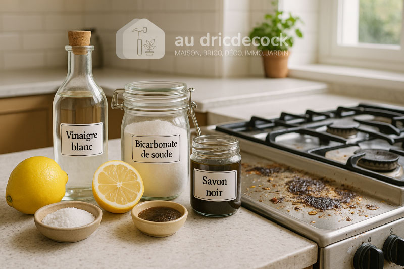 | Vinaigre + Bicarbonate | Vinaigre blanc, bicarbonate | Plaques, hottes, carrelage | Désinfecte et désodorise | 5 min |